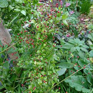 雨ですね☔ 昨日見つけて撮るの忘れてた、スマイラックスと三時草 スマイラックスは、春先に出て来るのに、今頃出て来た🎵 三時頃に花が咲くと言われてて、小さな可愛い💕花が咲きますが、丸いのも可愛い💕