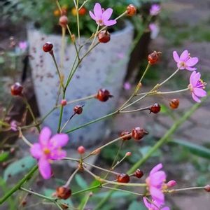 山野草【ハゼラン】 雨音♪☔️おはようございます 皆様良き週末を 「爆蘭」開花が午後3時頃。なので三時草とも呼ばれる。球形の蒴果はつやのある赤褐色で美しいところから、英名をコーラルフラワーと言い。若葉は食用になります📖🥢今はまだ早くてついて無いですが紅色の粒々がついてきます、花火草とも。⚪︎。⚪︎◯🔴⚪⚪︎。⚪︎🐈⬛🌸🎶