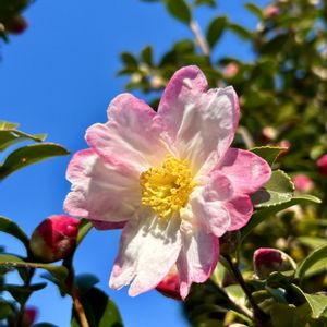 おはようございます✨ 今日のお花 山茶花ですね 毎年この頃になると 焚き火のフレーズのある 歌が聞こえてきそうな 小春日和 わくわくします 1️⃣会社の中庭 いつもならば早々に 雪囲いされて 余りお花が見られませんが 今年は幾分花の方が 早かったので 近くまで行ってぱしゃり しました。 いつもこんなピンクだっけ…? 紅いイメージの花ですが…? 2️⃣以降は 我が家の山茶花 3株ありますが、 いちばん早く咲いた子です いちばん遅くにお迎えしました 染め分けがかわいい…☺️ 後の2株は 蕾有る子ひとつ 最初にお迎えした子は 寒椿ならぬ寒山茶花… 山茶花も、咲く時期が幅広いのだとか…☺️ 知らずに🏷️を見て 白いかわいらしい花🌸 一目惚れしてお迎えしました。 その年咲いてくれましたので 満足なのですが 寒風にさらされて耐え 春先の暑さにも耐えたあと 夏が暑い年なのに南側に移植…😱 でも次の年葉が出て来てくれて…☺️ そのまま3年目 まだまだ蕾は有りません。 気長に待つのか…? も少し半日陰に植え替えか…? 見守るばかりの、白花さんです…✨
