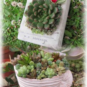 こんばんは😊 ⬆️この間投稿した寄せ植えです🎶 挿しておいた『ベビーサンローズ』のお花が咲きました🌸✨ 髪飾り付けてるみたいで可愛いです😍 ⬇️5月にグリーンテラス葉山さんで買った貝の鉢にちまちましました🤗 私はちまちまするのにかなり時間がかかってしまうので…やっと購入した鉢全て植え終わりました😆 あとは夏越し、頑張ろ〜(๑•̀o•́๑)۶ FIGHT☆︎