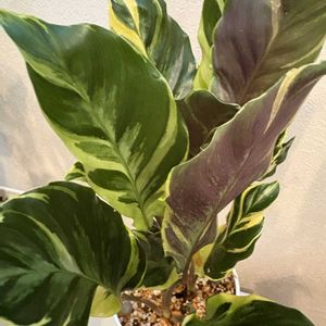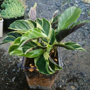 カラテア ローウイゼエンペラー 傷んだ葉をあらかたカットし 植え替えました 園芸店にかなり放置されていたようで 根鉢状態💦 お買い得だったので良しとします😅