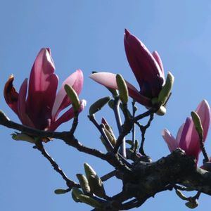 4月16日 今日のお花 ♡☆*:.。. モクレン.。.:*☆♡ モクレン(木蓮)早春、大きな白い花が上向きにさく。花弁が完全に開かず、半分閉じたような咲き方で、華やかな香りがある。 花の色が濃い紫色。木の高さは3〜5mで、よく枝分かれする。 ①公園 2025.3月撮影 ②③庭木 2025.3撮影 ④お友達から 2024.3月 ⑤2024.3月服部緑地都市緑化植物園にて 🏷️水曜日は白い花♡ 🏷️愛しの紫 🏷️好き好き大す木♡ 🏷️樹木見上げ隊