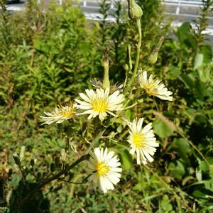 ご近所の空き地で見ました。 色の薄いタンポポ?と思って見たら、高さは40~50㎝あるし、葉っぱ🌿は舟形だし、今まで見たことない気がします。 でも、🐶お散歩中、時々見かけるようになりました。今まで気付かなかったのかしら… 名前を教えて頂きました。 「アキノノゲシ」です。