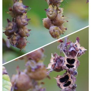 ★ 弾き飛ばしちゃおうシリーズ トサミズキ 土佐水木 マンサク科トサミズキ属の落葉低木 春先に 爽やかレモンイエローのお花を咲かせますね。 この写真は 昨年秋11月です。 ⬆ お花が ぶら〜んとぶら下がる穂状だったので 実もそんな風にぶら下がってますね。 まだ完熟していない果実 (さく果)はコロッと丸く 二本の角が見えます。 角みたいなのは 2個の花柱が残ったものです。果実は中で2室に分かれてて それぞれ1つずつ種子が入ってます。 ⬇ ぐぐ〜んと、拡大してみて下さい。 怖っ エイリアンが お口を開けて噛みついてきそう。 うきゃ〜 完熟し乾燥すると 外果皮が裂けて大きく開きます。 その時 中から 黒い種を弾き飛ばします。( 種子は膜状種皮に包まれており それがバネ仕掛けのように弾ける) とは、言っても 私は 飛ぶ瞬間を見たことありません。 観察した方のお話によると、(ネット情報) パチッんと音をたてて弾き飛ばし なかなかの威力なんだとか。 この写真は 口が開いてて 中の種はもう弾き飛ばした後ですね。 見てみたいなぁ〜! お花の投稿 2021 3/16 撮影 2021 11/3 帝京大学板橋キャンパス
