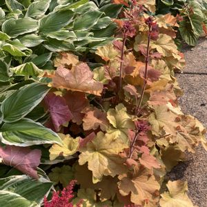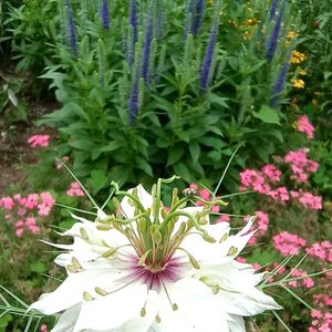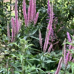 ① ヒューケラのお花が咲きそうです!!ホスタに押されてギュウギュウです😅 ②ご近所さんに頂いたラムズイヤー2年目はやはりこうなりました🤣 ③ベロニカさんも大きくなりました。 ④ニゲラのピンクとシモツケのピンク🩷 ⑤リクニス2種のコラボです!!