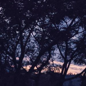 今しがた日が暮れて…。 庭の木々の向こうの秋夕焼け。