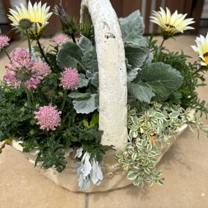 ガーデニング講座での寄せ植え❣️ ギャザリング風に密に植え込んあります。籐の可愛いバスケット仕上げです💕