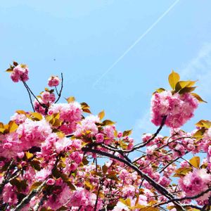 ソメヨシノさんが終わり次は八重桜 かなり満開🌸丸いポンポン 空を見上げたら飛行機雲✈️付