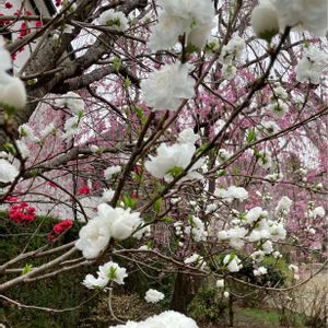 桜見に行く途中、遊歩道に奥は枝垂れ桜と紅梅?と白いのは桃の花⁉️👀 🌿🌸🔴🌸⚪️🌸🌿