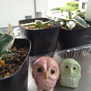 連投になります。 1つ前のアガベの写真。 プミラクラスターフェスト これが元の親で、昨年6月に買った時の写真。左に写っている豆粒みたいな可愛い赤ちゃんが、さっき投稿した写真です。 1年近くでかなり子株は成長したのですが、肝心の親株😅 根っこを傷めてしまい、外葉が枯れて、今は形が崩れています。 ほんとに雨も注意🥲 とにかく、コロンとした形で、めちゃくちゃ可愛いです (*´艸`*) 刺してくるトゲもありません 🤣🤣🤣