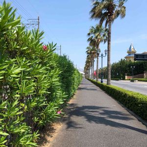 ディズニーリゾート キョウチクトウの生垣がつづいてますぅ😊 お花数が少ないのが 残念 たくさん咲いたら 綺麗なんだけどなぁ…… 6月16日 スマホ撮影