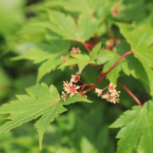 新緑の美しい季節を迎え、若々しい青いもみじが… 今の季節だけ見られるもみじの花♪ シベが跳ねています。