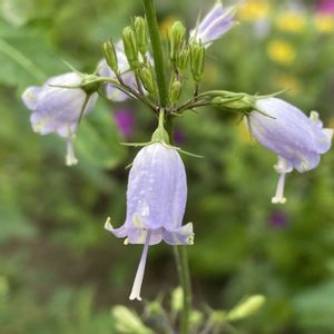 おはおはようございます😊 我が家のツリガネニンジンが咲き始めました🩵 良く見ると、花びらの反り返った部分の内側がグリーンです。可愛いですね (ღ*ˇ ˇ*)。o♡ ⑤おまけのブルーウイング、次々と蝶々のような可愛いお花を咲かせてくれます(*˘︶˘*).。.:*♡ 🏷水曜日は水色 🏷山野草マニア