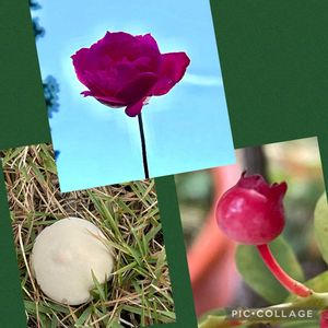 🍀朝から、気分的にのんびりしています。 ☆昔々からある名前も分からない薔薇🌹 ☆ボビスタプラムベア(アがたりませんでした🙏) 芝生に何か落とし物❓と思いました😉 ☆ブルーベリー ポツンと一個
