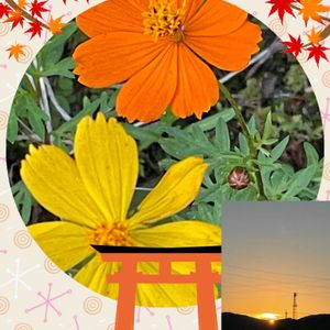 🍀今晩は🌛 今日は、一日中晴れ〜〜の青空でした。 ☆キバナコスモス 夕陽はあっという間に沈みますね。 もう一度、撮り直そうと思ったら、もう沈んでいました😅