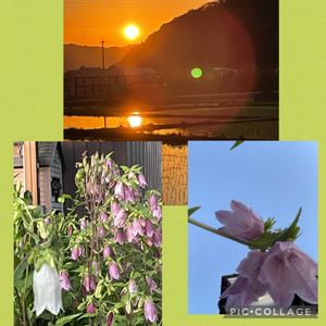 🍀散歩から帰ってきた所です。 とれたての夕陽🌇 間に合いました🩷 ☆ホタルブクロ