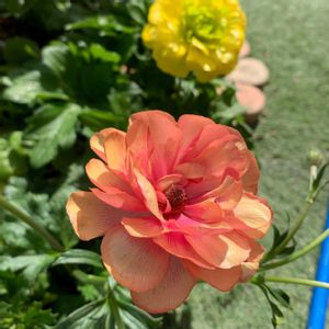 ラナンキュラスラックス ハデス咲きました😊 花弁が一枚だけキメラっぽいですね🍀 背後に映り込んでいるのはキュベレー🌼