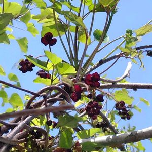 お散歩中に見た果実(樹木)たち… センダン(栴檀) シャリンバイ(車輪梅) クサギ(臭木) ナンテン(南天) ミツバアケビ(三葉木通):お庭 ⚫︎⚪︎⚪︎⚪︎⚪︎