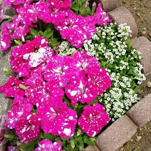 切り戻したアリッサムがモリモリに。 ペチュニアもいい感じ😍 両端には別のペチュニアを植える時に千切れたのを挿し木してみてるけどピンクのがかぶさってきて見えない😅 枯れてはないのでこのまま根付くといいなー😳