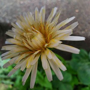 白色と黄色の色合いのタンポポが一輪咲いています。 日陰でお洒落な色合いに~