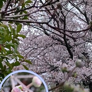 少し散り始めた薄墨桜💮💮💮 右上に赤っぽくそびえているのは花の木です🤗