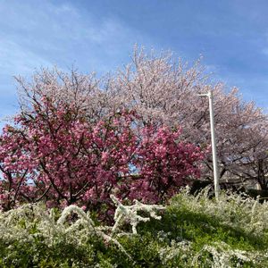 昨日とほぼ同じ所から撮ってみました。 バックの青空が花々を引き立てているね🌸 花海棠にユキヤナギに桜の花 いつもの道で〜🚶♀️t