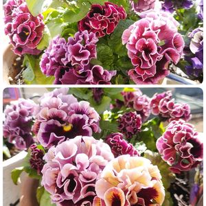 サトウ園芸さんのパンジー達 ↗️picはローブ・ドゥ・アントワネット ソワレ👗🍷😌💓深い赤紫のベルベット調のフリルをまとった高貴な貴婦人って感じ😌✨ ↘️picのドラキュラはちょっと小ぶりで可愛い子に出逢え目を瞑れず連れ帰った特別な子なんです😊💓