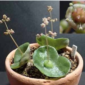 クラッスラ属 アンブレラ“ワインカップ” 7分咲きくらい🌼 花芽の根元が膨らんできたのは、折れない為なのかな❓