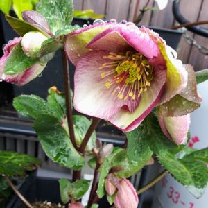 おはようございます😄 夜中からの雨が降り続いています☔ クリスマスローズが傘みたい👀❗ 雨粒コロコロ➰➰💧 クリスマスローズ グレンダズグロス** ニゲルの交配種に嵌まってます🎵 昨年9月に蕾無しでお迎えです🤗 大理石模様の葉っぱがお気に入り🌟 来年以降モリモリにしたい😆👍❤️ 《品種記録》 オランダのWinter Angelsより発表された 「Frostkiss®」シリーズの1種。 「Frostkiss®」シリーズのクリスマスローズは様々な原種を掛け合わせて誕生したシリーズ 様々な原種間交配種がある中、このシリーズは丈夫さ、生育の早さが優れており、病気になることもほとんど無いため、世界的に評価され、人気が高い。 ペニーズピンク’‘アンナズレッド’の姉妹品種であり、姿は似ていますが、このシリーズでは初めてのピコティ咲き。 交配親は明らかではありませんが、特徴からリビダス、ニゲル、オリエンタリスなどの交配種。 淡いピンクの花で紅色のふちどりが入るピコティになる。 丸いカップ状の花型も美しく、大輪で花つきも良い。葉は厚みがあり、周年常緑で、大理石模様が入る。