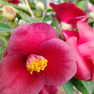 椿・令和物語 茶化の女王編 二十八頁 紅嵐(べにあらし) 紅色の獅子〜大唐子〜二段咲きと変わりやすい。 中〜大輪。 2022/03 上旬