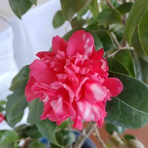 椿・令和物語 茶化の女王編 二十四頁 北の洋(きたのなだ) 桃紅地に白斑が入る 牡丹〜獅子咲きの小輪。 ユキツバキ系。 2022/03 上旬