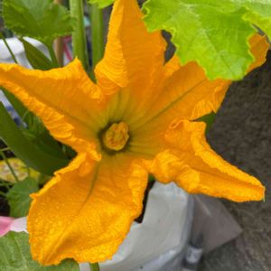 ズッキーニの花、巨大で怖い🤣 多分雌花なんだけど、まだ雄花が咲いてないので、ダメ元でスプレータイプのトマトトーン掛けてみました😓 成分は同じだけどズッキーニには薄いのよね😓 まぁ、上手くいけば儲けもんです👍