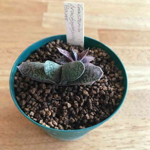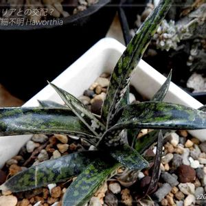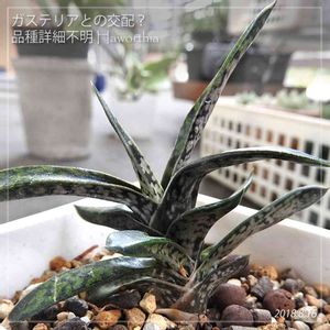 ヤフオクで入手。出品者も「ガステリアとの交配種? 品種詳細不明 ハオルチア」としていたように正体不明。ハオルチアの棚にいたのかもしれないけれど、この葉っぱの模様はガステリアっぽい。この葉っぱの模様が気に入ったのと、ガステオルチア(ガステリア×ハオルチア)だったらいいなーという期待を込めて。