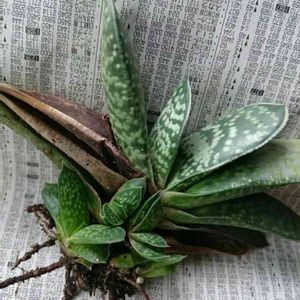 外植えの ガステリア 子宝 大きな葉の幅は3㎝くらいに育っています 諸事情で日が当たらなくなったので 鉢あげして 外管理にします