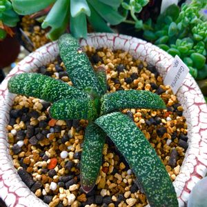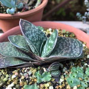 本日、種と苗を扱ってるお店に用事で寄ったら☺️、お店の方が趣味で多肉植物を育ててるらしく☺️、増えて物を販売してるガステリアを2つもゲットしました😆👍️❤️。 1つ¥150(税込)で販売してるから思わず、こんなに格安で購入出来無いと思い、即購入してきました😆👍️❤️。 後で気づいたのですが😅、種類の名前を聞くのを忘れてました😅。 何の種類でしょうか😅? 野菜の種や苗等を育てて販売してる方だからか😅?セダムの虹の玉等も有りました😆👍️❤️。 その虹の玉の玉がかなりの太さで驚き😲、肥料は何を使ってるか😅?を聞いたり、参考されていただきました😆👍️❤️。