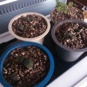 葉挿ししといた臥牛の子分達を植え替え。 深い緑に白いざらざらが乗って、かっこいい親分から生まれました。 臥牛の肌の表現も色々あるみたいなんだけど、どれがノーマルなのか全然分からん!笑