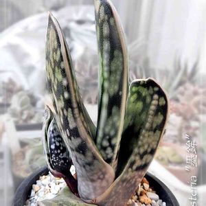ガステリア、墨鉾……だけど、ネットで見かける墨鉾より明らかにごつい。このごつさがいいんだけど。ベランダで剥き出しで冬越ししたのに、12月より真ん中の葉が大きくなってるし、左側の子株の根元は茎みたいになってるし。生長が楽しみなような、(どんな形になるのか)不安なような。