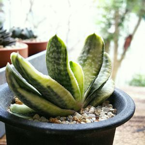 ガステラロエ(ガステリア×アロエ)・ホワイトパール。シルバーウィングとか別の名前で見かけるものでそっくりなのがあるけど。買った名前はホワイトパール。秋ぐらいに葉がぺらっぺらになってしまって、ただいま徐々に回復中……だと思う。がるテリアっぽくもありアロエっぽくもある、不思議な感じと灰色がかった色合いがステキ。生長はゆっくりめ。