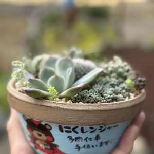 🪴 にくレンジャー登場‼️ 寄せ植えしたよぉ〜😆🎶サボテン🌵もIN 👍多肉さん少し大きかったかなぁ〜🤔 可愛ゆくできたでしょ🤗💕 🪴 # @korochat #にくレンジャー #まゆくま鉢 #寄せ植え #多肉植物
