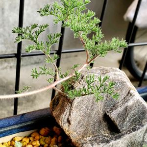 ペラルゴニウムのエメラルドグリーンの産毛は、藍色の盆栽鉢によく映える😊