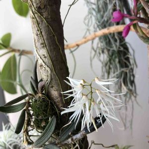 Den. linguiforme 木に着いてる、デンドロビウムの原種リンギフォルメ。 自然界ではこんな風に着いてるんだろうなー、と想像😌 葉っぱの筋が可愛い😍