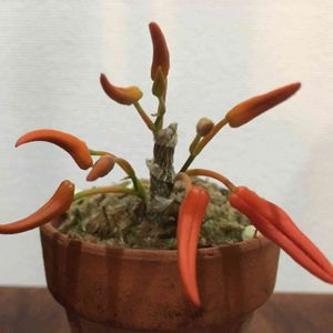 Den.faciferum デンドロビウム・ファシフェラム 先日投稿したファシフェラムが開花しました。 蕾の時は色が薄くて開花しても綺麗なオレンジ色にはならないだろうなと思ってたのですが、開花直前になると綺麗に色付いてきました。 花は小さいのですがオレンジ色でバルブの先に集まって咲くので見応え充分です😊 あまりデンドロっぽくない花で下向きに咲くので写真が取りづらい…😅