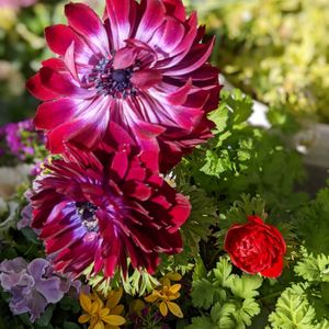 同じ苗から違う色のアネモネが咲きそう😲 2種類の球根が植えてある苗⁉️なんてあるのかしら🤔 *作った所に聞いたら赤〜ボルドー〜濃い紫まで咲く場合があるとお返事がありました❣️