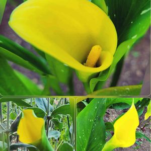 おはようございます😊 『黄色のカラー』 サトイモ科 和名 「和蘭海芋」 花言葉「壮大な美」 花に見えるのがホウ です、上段の真ん中の突き出ている黄色い棒状のが花です。 黄色は明るさ、元気、幸福感を見せてくれてますねぇ✨😀