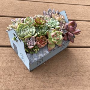 トロピカルガーデンさんの母の日セットがボロボロになったので、仕立て直ししました😊 表と裏から😊 残ったのは、1枚目の方、1番手前に植え直した4つだけ 笑😆 後は、お家🏠の葉挿しっ子やカット苗を入れました💕