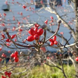 会社のハナミヅキ 葉が落ちて、赤い実と花芽だけとなりました