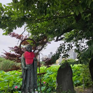 お地蔵様&ハス 🏷️毎月14日は石の日 参加します。 上野不忍池を背景にたたずむお地蔵様は人々の幸せを祈るお地蔵様 ハスの見物客は足を止めてはいかがでしょう😂