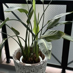 ストレチア(極楽鳥花) 今年の春に枯らしてしまった金のなる木の空いた鉢に息子がプレゼントしてくれた大きな😱ストレチア。今から花が咲くのが楽しみと枯らさず 育てられるかドキドキです。