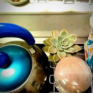 雑然とした台所に、突如として多肉植物が出現!! 徒長白牡丹の切った上の部分、置いとくのにちょうどいい所が他になかった😅