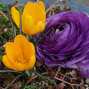 🏷青い花と黄色の春2022 🏷青い葉っぱマニア 🏷(祝)チーム・ブルー2周年 黄色いクロッカスの花と紫色のハボタンが仲良く並んでいました💕 🏷No more war🇺🇦 🏷ウクライナに平和を🌻 🏷平和を願う🍀
